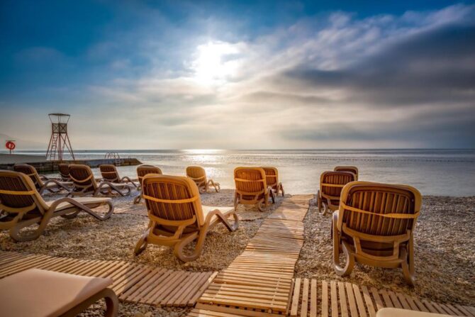 Здесь действительно можно не только хорошо отдохнуть и зарядиться бодростью на весь год, но и подлечить здоровье – работают профессиональные врачи. Также большое внимание здесь уделяют детскому отдыху: нанята команда аниматоров, построен клуб «Лимпопо», детские пляж и бассейн. Другой немаловажный плюс этого места: в отеле всего 202 номера. А значит нет очередей, занятых лежаков, столиков и переполненного пляжа. Территория вокруг корпусов красиво оформлена: повсюду цветут розы и декоративные растения, есть ландшафтный парк редких растений. Гости спускаются на пляж при помощи лифта с панорамным остекление, что весьма необычно. Основной минус – это завышенная цена, соответствующая скорее отдыху на уровне 5 звёзд, но никак не 4. От аэропорта Симферополя до гостиницы добираться около 2-х часов.