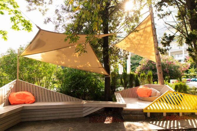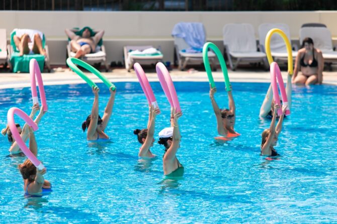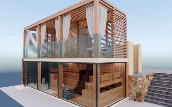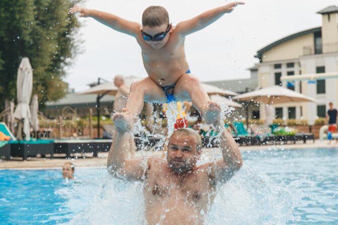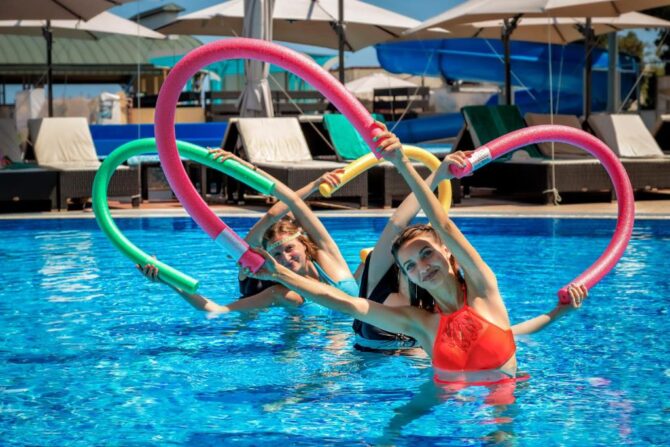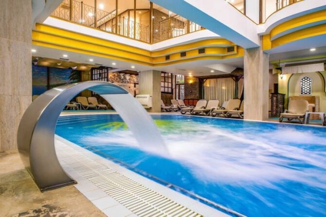 Бассейны уличные порадуют любителей поплавать чистой водой, противотоком и системой «быстрая река». На улице рядом с бассейном устроена парная с панорамным остеклением – неожиданное решение, которое не встречается в других отелях. Идея в том, чтобы не ходить в халатах до парной и обратно через весь отель. Также есть крытый бассейн с подогревом морской воды, что актуально в межсезонье или в те редкие дни, когда на побережье приходит ненастная погода. Вокруг воды расположены лежаки и шезлонги, а также зонты против палящего солнца. Территория аква-термального комплекса облагорожена зелёными насаждениями и цветами.