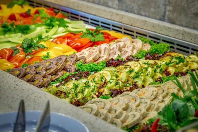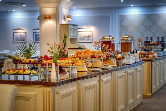 Шведский стол в ресторане «Paradiso» очень хорош и стоит своих денег. Меню от шеф-повара разделяет пищу на три категории: обычную, фитнес и детскую еду. Представлено неплохое разнообразие горячего: паровые биточки и рыба, жаренная индейка и колбаски, жаркое и телятина и т.п. Три-четыре вида супов, столько же салатов. Фрукты: виноград, бананы, апельсины, грейпфруты. Нарезаны колбасы, грудинка, красная рыбка. Представлено несколько видов хлеба, в т.ч. бездрожжевой и зерновой. Дети оценят 10 видов десертов, а также фонтан из шоколада, в который можно окунать выбранный кусок. В довершение есть небольшой выбор соленьев и разнообразные соусы. Из напитков, помимо обязательных соков, можно выделить кофемашину, которая умеет делать несколько типов зернового кофе. Еды на шведском столе много, сотрудники регулярно подносят новые блюда. Поскольку пансионное питание в «Пальмире» на столь высоком уровне, то рекомендуем брать путёвку с полным пансионом. Плюс в том, что не нужно тратить время в ресторане, выбирая еду по картинкам и ожидая около часа до тех пор, пока официанты начнут выполнять заказ.