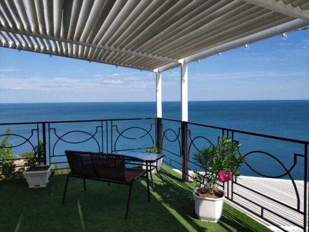 Каждый номер выходит на общую широкую террасу с парапетом, с которой открывается тот самый панорамный вид на море. Есть личный закуток, в котором предусмотрены столик со стулом, сушилка для вещей и зонт.