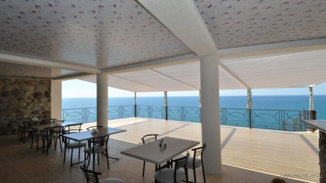 - Несмотря на довольно-таки удобный и цивилизованный вид, террасы опасны для детей лет до 6-10, прежде всего потому, что на парапет очень легко забраться, а затем кувыркнуться вниз. Кроме того, террасы не затенены, и днем там палящее крымское пекло, а не отдых. Зонты есть, но они не укреплены, и любой, даже самый маленький ветерок, может унести их в Никарагуа.