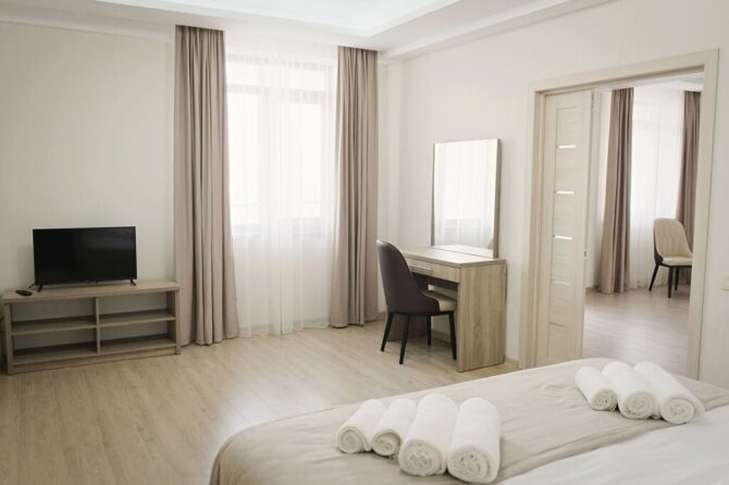 - Стандарт (22 кв. м) – однокомнатный номер с балконом и видом на лес и горы. Есть комнаты с одной двуспальной или двумя односпальными кроватями. В ванной установлена просторная душевая кабина.