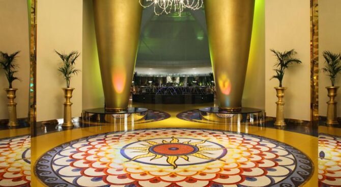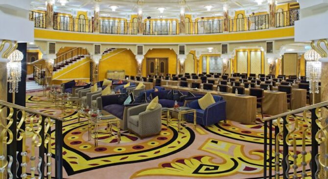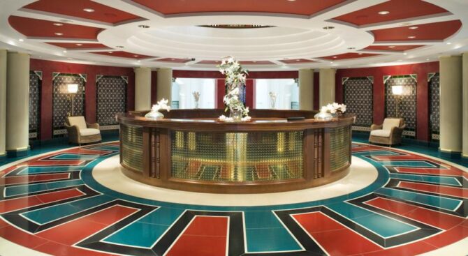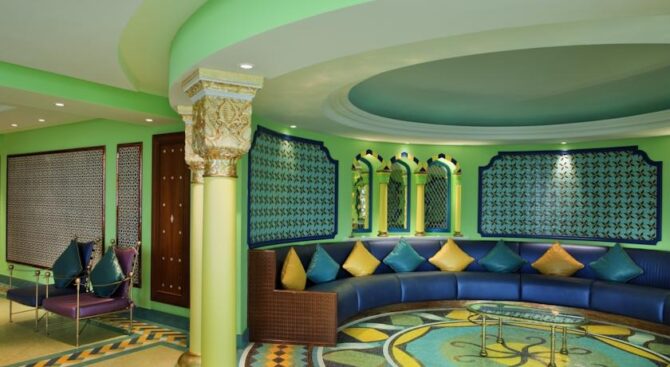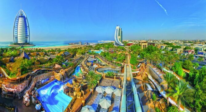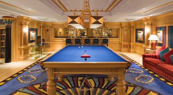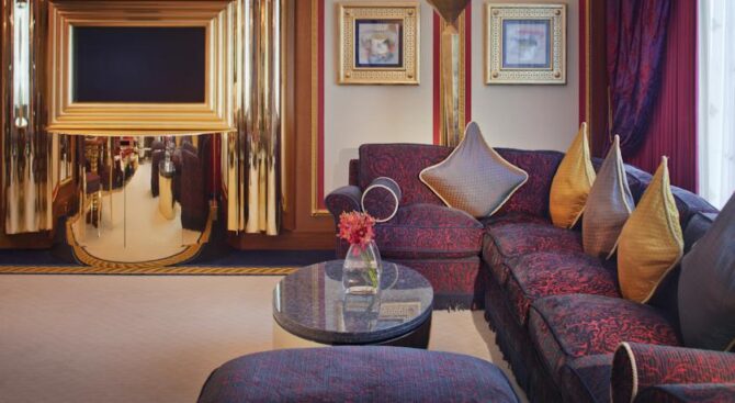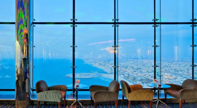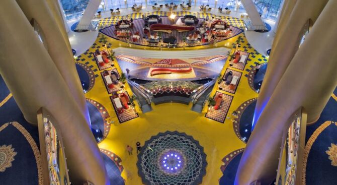 В отеле Бурдж-эль-Араб, созданном в виде паруса, есть все, для того чтобы угодить даже самому взыскательному клиенту — даже трансфер на роскошном автомобиле Ролс-Ройс с личным водителем. Для постояльцев, которых уже ничем не удивишь, заведение предоставляет услуги экскурсии на вертолете, поднимающемся в небо со специальной площадки на крыше здания отеля. Роскошно отдохнуть можно на просторной террасе, на которой расположены пляжные домики и бассейны. Кроме того, можно посетить несколько ресторанов или баров, среди которых известный во всем мире Nathan Outlawat Al Mahara.