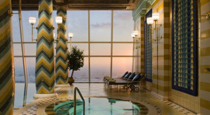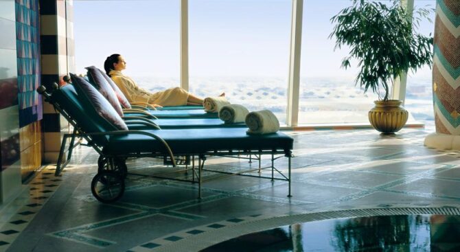 В Бурдж-эль-Араб работает спа-центр, который предлагает своим посетителям воспользоваться процедурами для поддержания красоты или для оздоровления. Гости курортного комплекса могут искупаться в одном из двух просторных бассейнов с теплой водой или отдохнуть в любой из 32 беседок, расположенных на уютной террасе заведения.