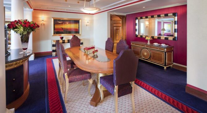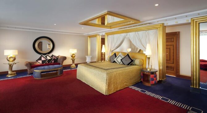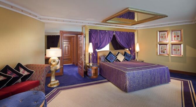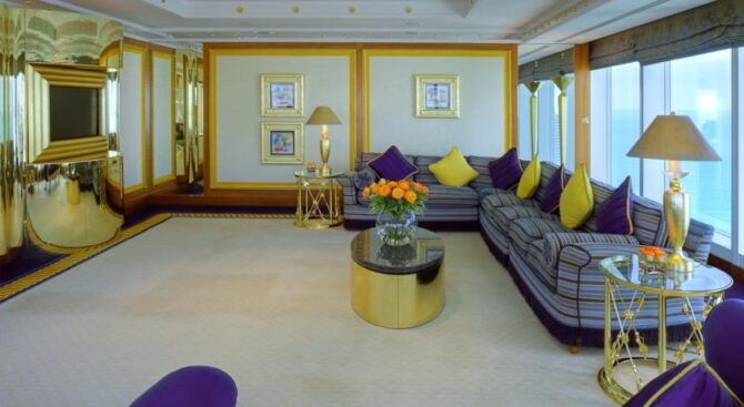 В каждом номере Бурдж-эль-Араб установлены окна, созданные французскими мастерами, из которых открывается великолепный вид на Персидский залив. Чтобы постояльцы могли всегда оставаться на связи, для них в отеле работает беспроводной интернет, стоимость которого уже включена в проживание.