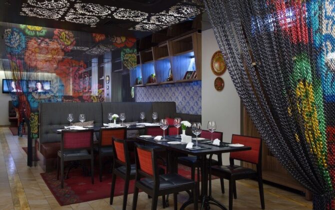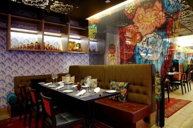 Благодаря красочному интерьеру просторного зала ресторана, в нем создается ощущение уюта, располагающего к общению. Шторы, свисающие с потолков и украшенные павлопосадскими узорами, делят зал на зоны, где можно уединиться вдвоем или с компанией друзей. Полки у длинной стены заставлены фигурами матрешек и самоварами. Тканевая драпировка, равномерное чередование каменных и деревянных панелей на полу – все это создает уютную и одновременно торжественную атмосферу настоящего русского ресторана.