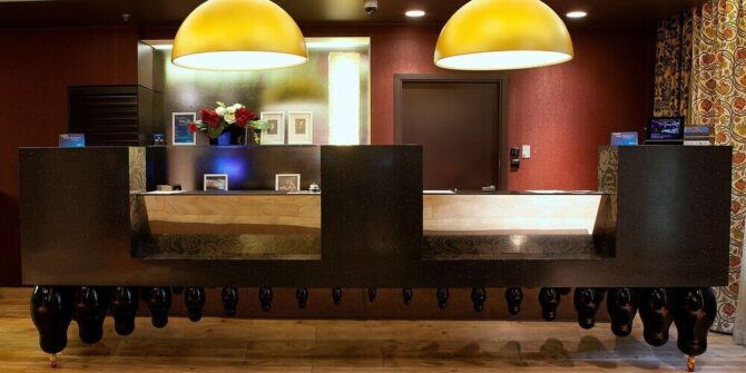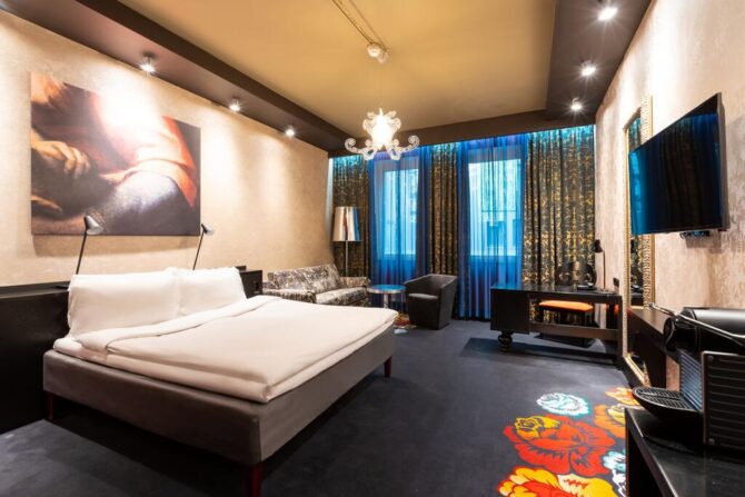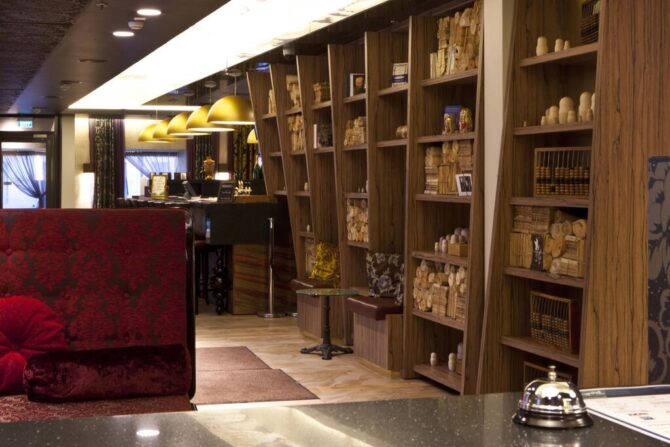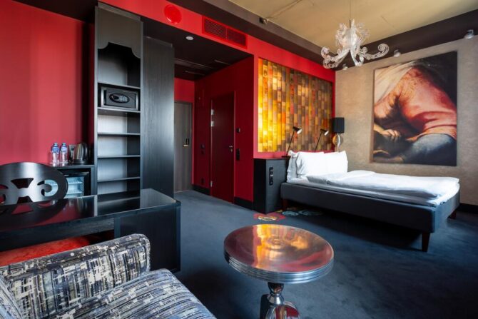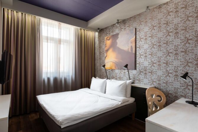 В оформлении интерьера гостиницы использовались мотивы и темы, взятые из «Преступления и наказания» – знаменитого романа Ф. Достоевского. В фойе установлены полки с книгами всемирно известного писателя. Произведения представленной коллекции на русском и иностранных языках были изданы в разные годы в России и за рубежом. На стенах и табличках дверей номеров можно увидеть цитаты из «Преступления и наказания», а также портреты самого писателя.