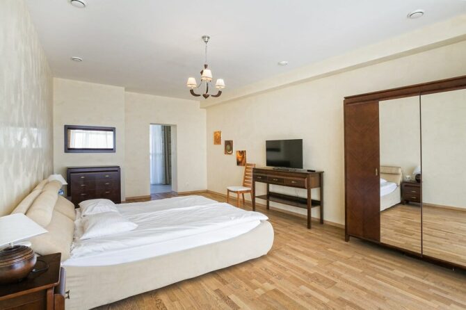 - Студио (60 кв. м) – комфортабельный однокомнатный апартамент для двоих с возможностью размещения еще двух человек. Комната визуально разделена на спальню и гостиную. Установлен полноценный холодильник, чайная станция, обеденный стол. В санузле имеется ванна и душевая кабина.