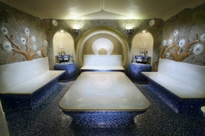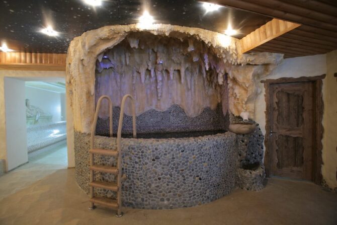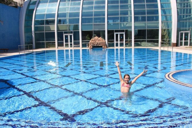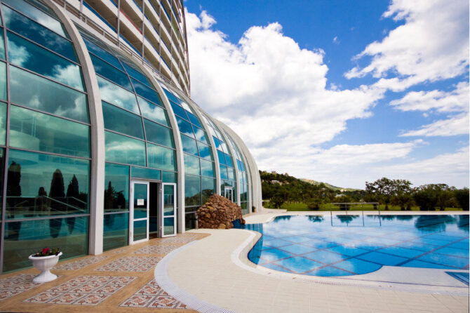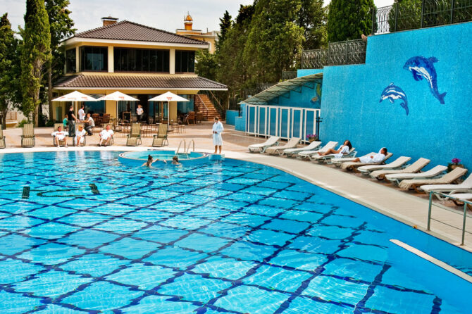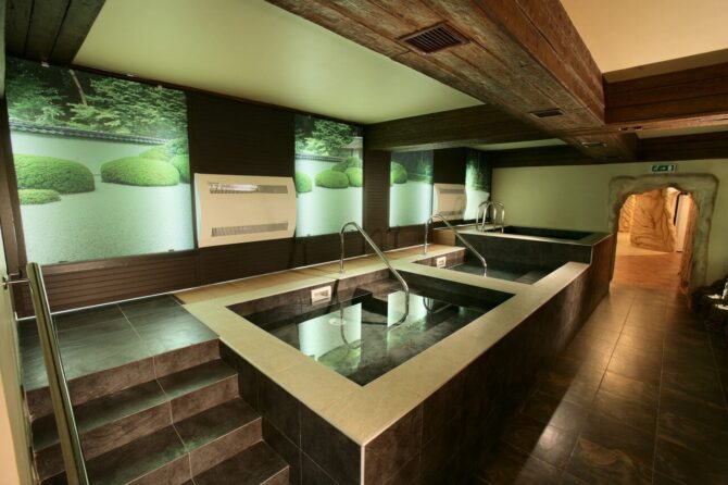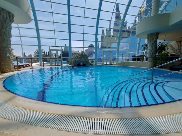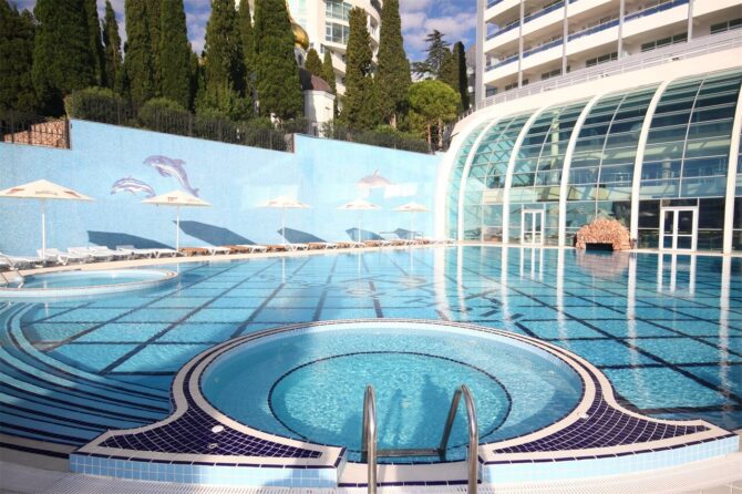 Отель пользуется популярностью благодаря изумительной велнесс-зоны. К услугам гостей крытый и открытый бассейны с двумя отдельными установками джакузи, бассейны сообщаются между собой, попасть в открытый можно проплыв, через грот. Опытные инструкторы предложат для гостей занятия по аквааэробике или научат ребенка плавать. Вода подогревается в зависимости от сезона и погодных условий, до 26ºC. Зона отдыха вокруг бассейна оборудована удобными шезлонгами, работает фито-бар с широким ассортиментом различных коктейлей и напитков. Открытый бассейн оснащен детской зоной купания (работает сезонно) и двумя чашами джакузи, которые подогреваются в течение всего года.