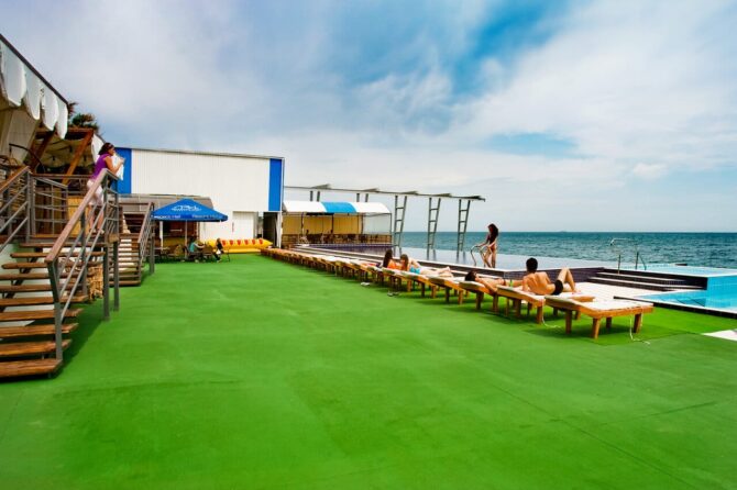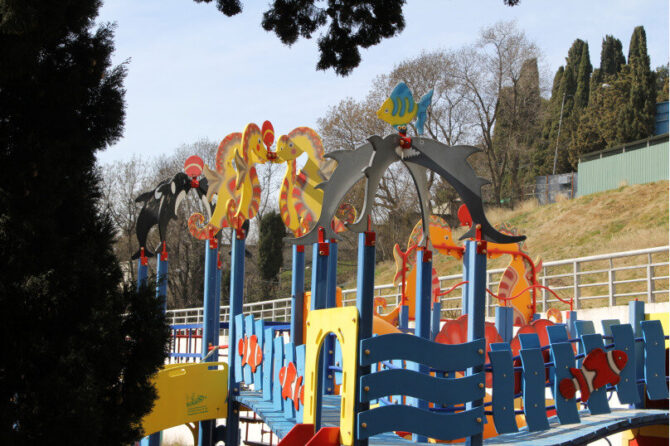- детский бассейн на пляже с морской водой, песочницей, качелями;