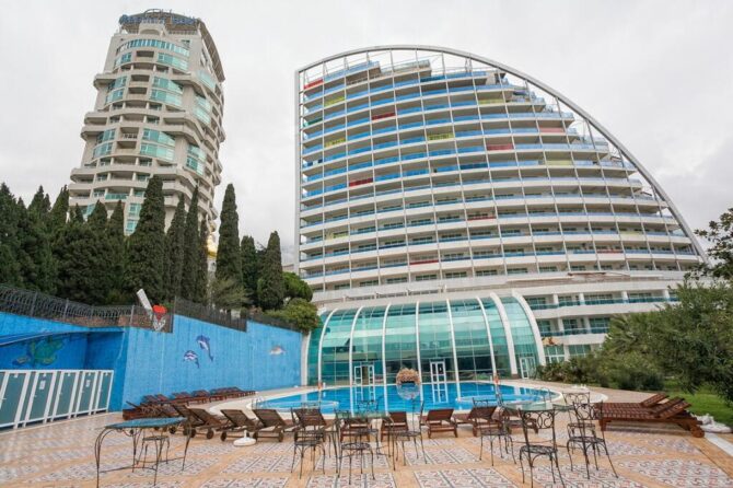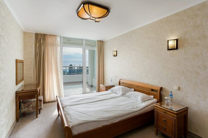 - Супериор Премьер (140 кв. м) – апартамент премиум-класса. Расположен на 9-м этаже корпуса «Парус». Имеет отдельный доступ на этаж. Просторная гостиная совмещена с кухонным уголком, в наличии 2 санузла (один с ванной, второй с душевой кабиной), с просторной террасы открывается вид на море.