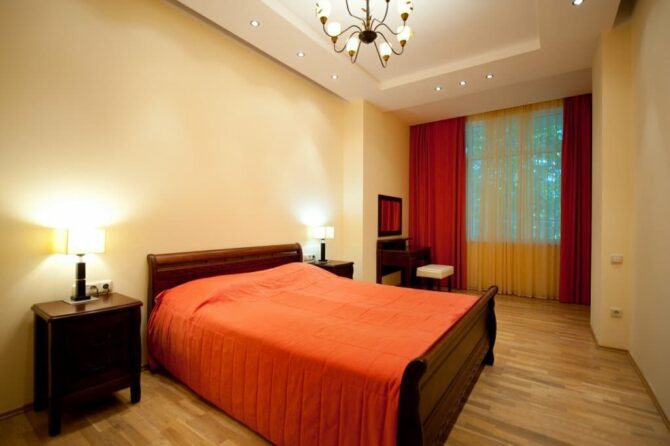 - Делюкс Дабл (43 кв. м) – однокомнатный комфортабельный номер с высокими потолками для 2-х человек, можно добавить еще два спальных места, воспользовавшись раскладным диваном и установив евро раскладушку.