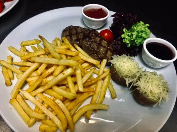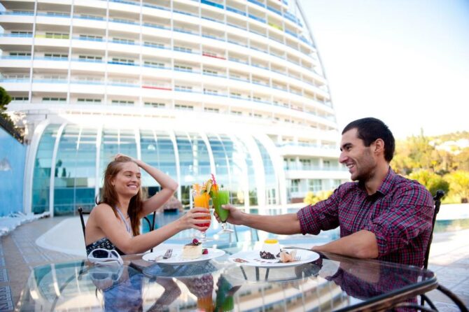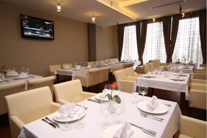 На территории работают два бара-ресторана, которые пользуются популярностью у жителей Ялты. Не секрет, что в отель приезжают на выходные, чтобы провести время в саунах, банях, джакузи и других приятных процедурах. Так как основной фонд в большей степени представляют апартаменты, владельцы не включают в стоимость проживания обязательный завтрак. Но предлагают шведский стол для утренней трапезы, полупансион (завтрак+обед), услугу «Рум-сервис» (доставка еды и напитков в номера). В барах имеется полноценное меню.