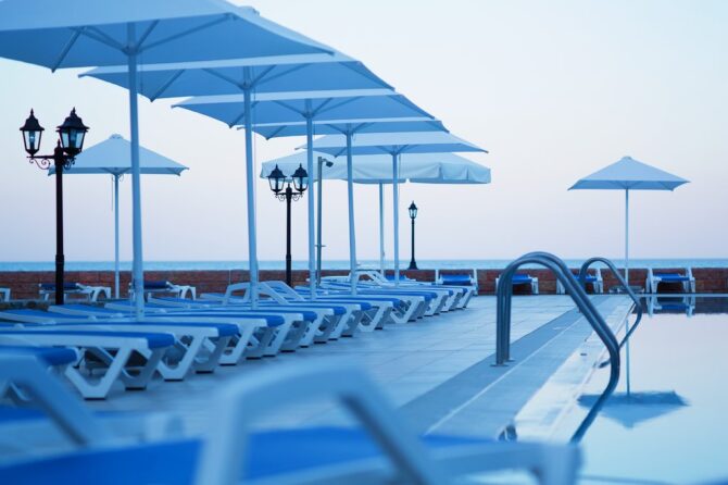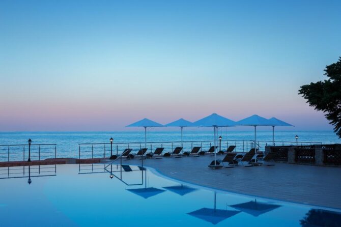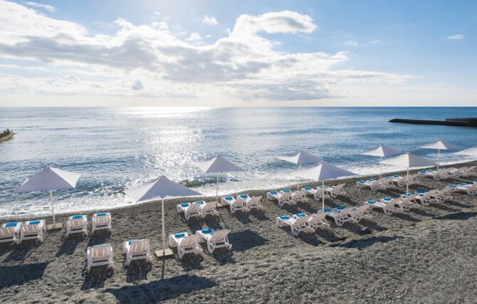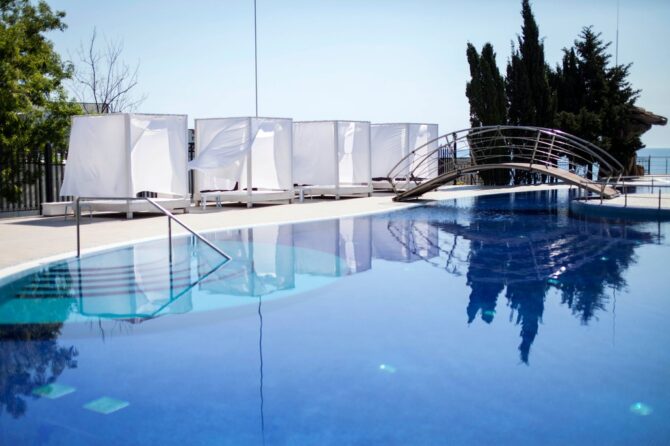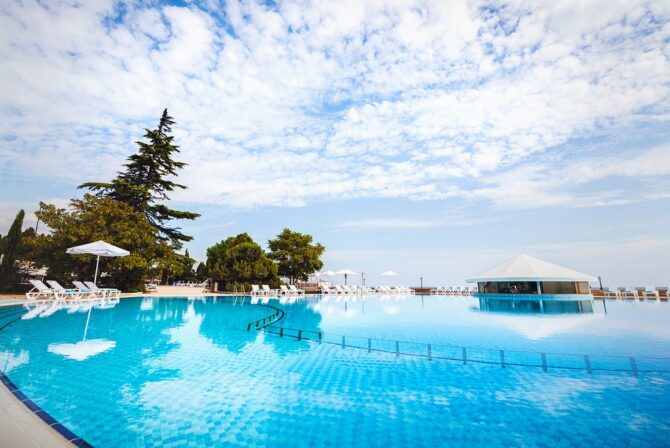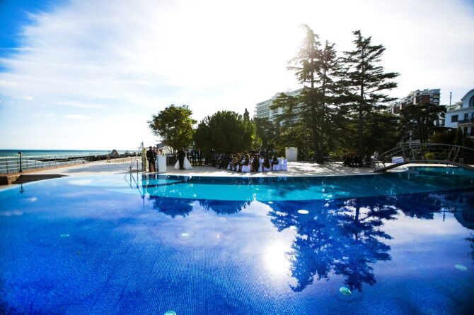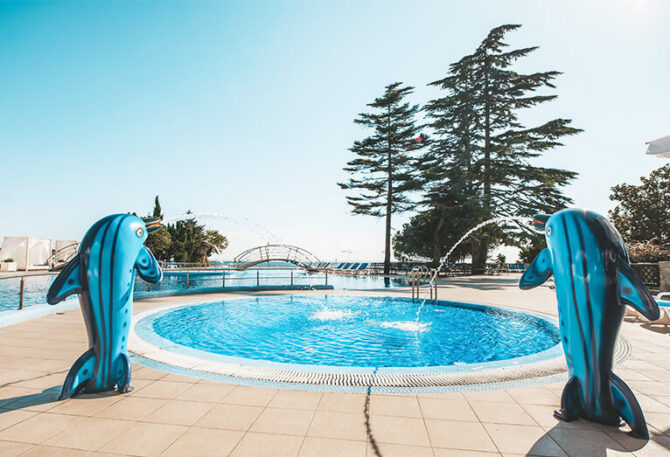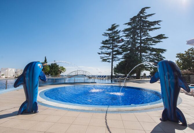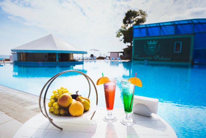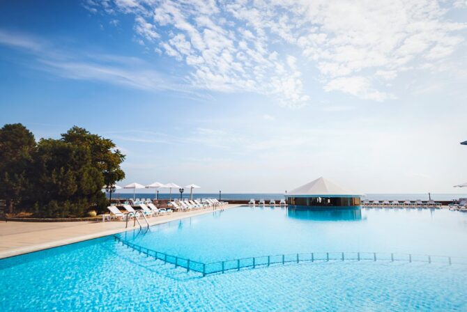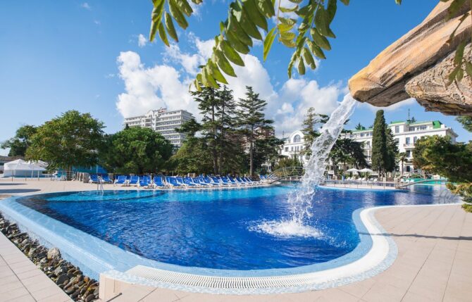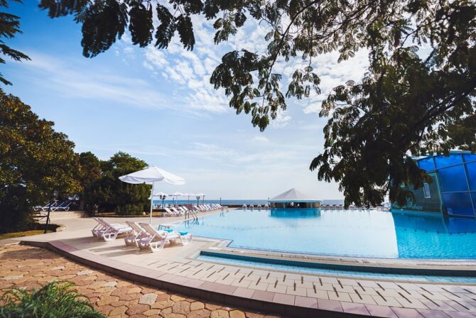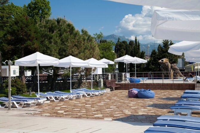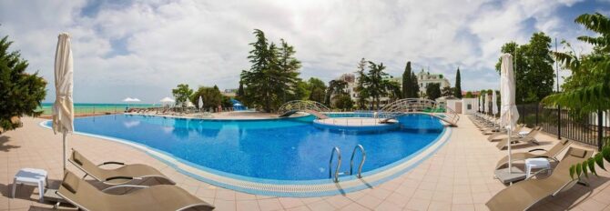 На территории Riviera Sunrise Resort & SPA расположено ни много, ни мало – четыре бассейна. Они настолько хороши, что отпуск можно провести около них, но ведь есть еще и лучший в Алуште пляж!