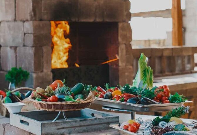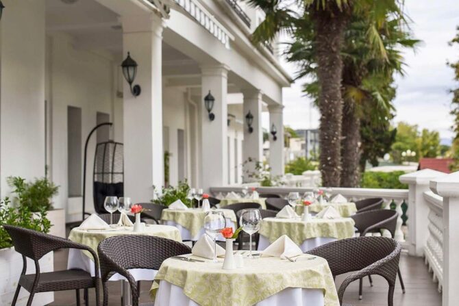 Летом, в высокий сезон, во дворе отеля работает мангал, на котором профессиональный повар жарит мясо под соусом. Кроме того, в лобби-лаунже корпуса Классик можно посидеть и поговорить, потягивая знаменитое шампанское «Новый Свет» и сладкий массандровский «Мускат Черного камня».