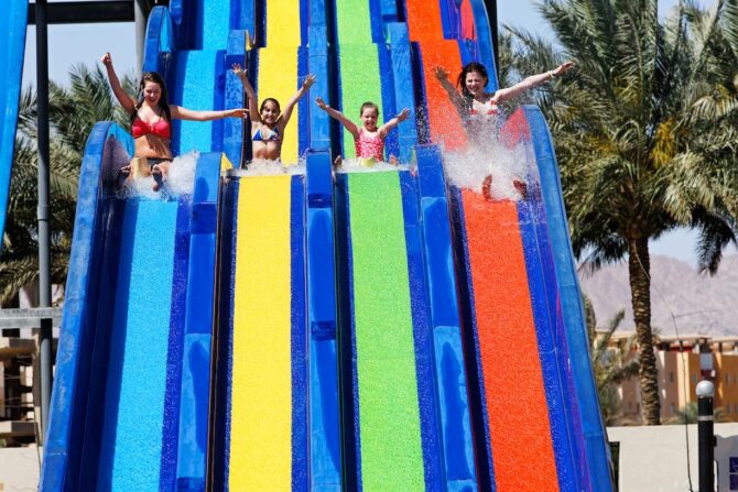 Но, а что же касается самих горок, то это всего лишь 5 больших взрослых. Первая горка из четырех одинаковых конструкций стала популярной среди туристов. Дальше две довольно резкие горки, потому как съезжать с которых нужно на коврике. И четвертая горка в этом бассейне — извилистая черная дыра. Съехать с нее надо на одноместном или двухместном круге. И горка действительно очень черная и страшная!