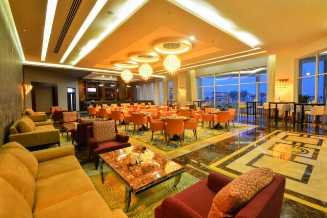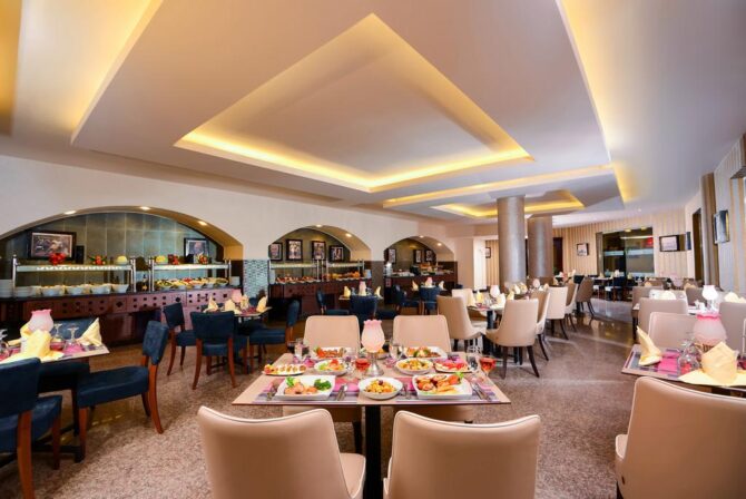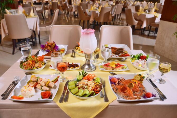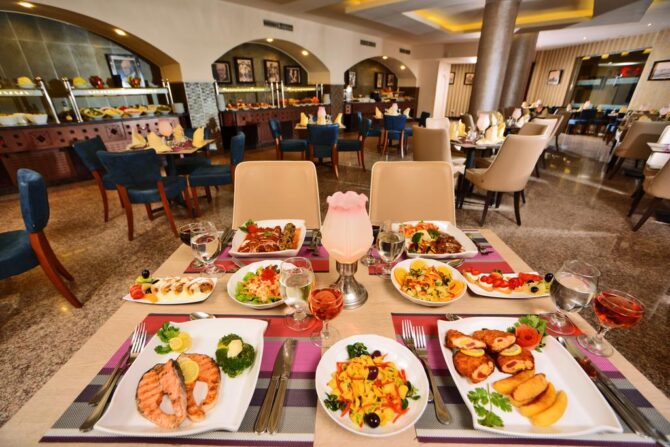 Голодными с отеля точно не уйдете, потому как питание здесь 3-х разовое. В меню предоставлены различные мясные, овощные и рыбные блюда. Есть большое разнообразие салатов, свежей зелени и маринованных овощей. Фруктов просто изобилие. Что касается десертов, то для гурманов это место является настоящим раем. Всевозможные тортики, пирожные, желе и сладости обязательно оценят сладкоежки.