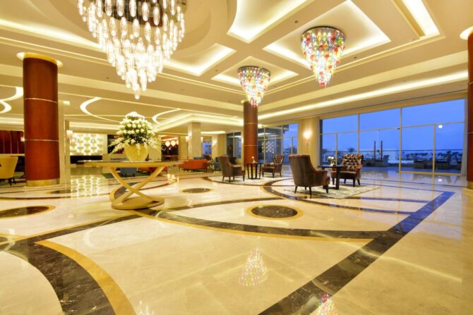 Заезд к отелю необычный, но вполне привычный для сети отелей Albatros. Ресепшн находится на горке, но он очень простенький и совершенно не помпезный снаружи. Когда заходите внутрь, то видите, что там очень все стандартно для пятизвёздочных отелей. Холл достаточно свободный и светлый. Мебель в нем также новая и яркая.