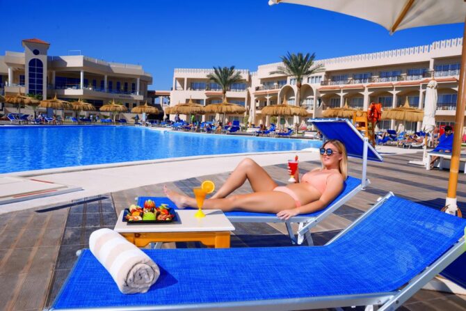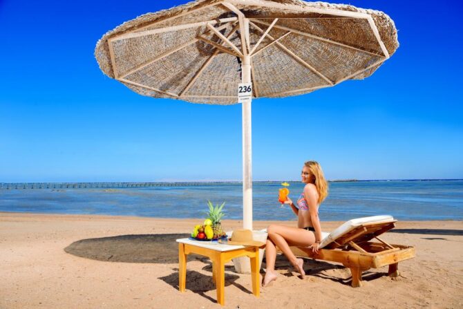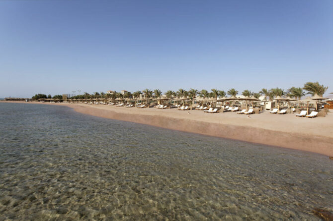 Песок на пляже довольно твердый и утоптанный, поэтому закопаться по шею в него будет очень сложно. Но зато пальмы на пляже создают очень классный вид и атмосферу. Здесь пляж довольно плотно уставлен лежаками, зонтиками с соломенными крышами и стойками от ветра. Лежаки добротные, деревянные с мягкими матрасами и подушками. Также на пляже есть большие лежаки размером с двуспальную кровать, по бокам которой свисают белый простыни. Вообще, в отелях Albatros лежаки всегда хорошие. И этот отель не стал исключением.