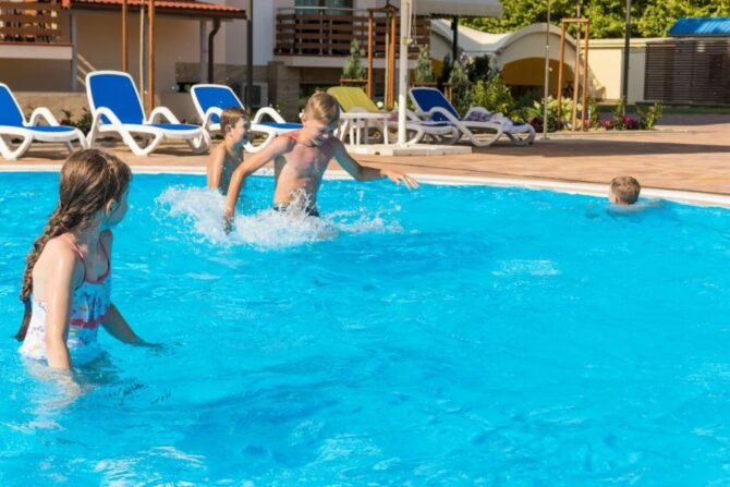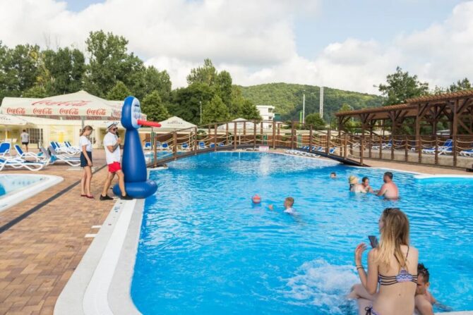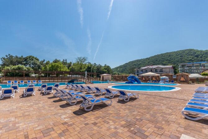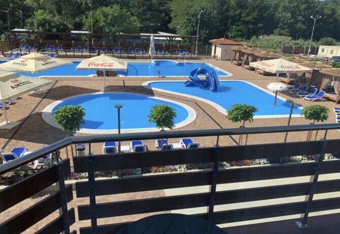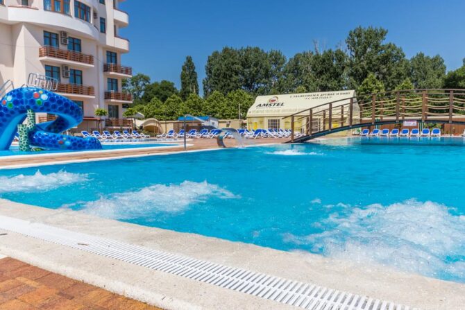 На территории отеля «Роза Ветров» оборудована аква-зона, состоящая из трех бассейнов разной глубины. Ее площадь 500 м2. Самый большой бассейн – глубокий, предназначен только для взрослых. Средний – глубина 80 см. В прохладное время года вода в нем подогревается, что дает возможность купаться даже при плохих погодных условиях. И третий бассейн – для самых маленьких постояльцев, то есть для деток. Есть горка и джакузи. Для дополнительного комфорта отдыхающих вокруг зоны установлены шезлонги и зонты.