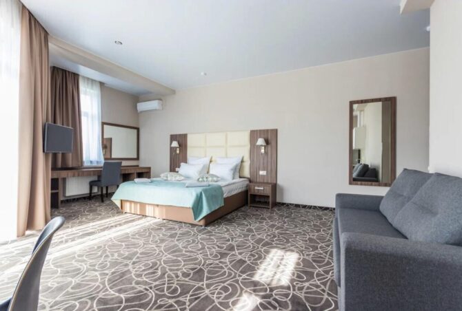 - семейный стандарт – достаточно просторный номер. Его площадь 30 м2. Состоит из одной комнаты. Его отличительная особенность — наличие двуспального раскладного дивана, на котором могут расположиться двое детей;