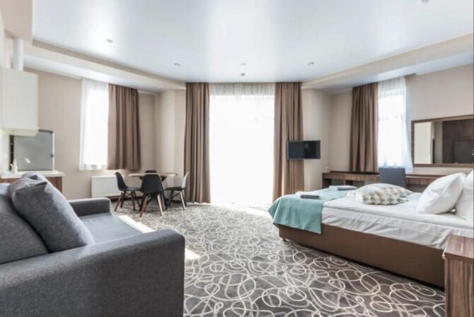 - студия – площадь 43 м2. Это номер с повышенным уровнем комфорта. Его отличительная особенность – наличие кухни с обеденной зоной. Идеальный вариант для тех, кто привык самостоятельно организовывать питание или путешествует с маленькими детками. Максимальная вместимость – 3 человека. Спальные места обеспечиваются большой двуспальной кроватью и раскладным диваном;