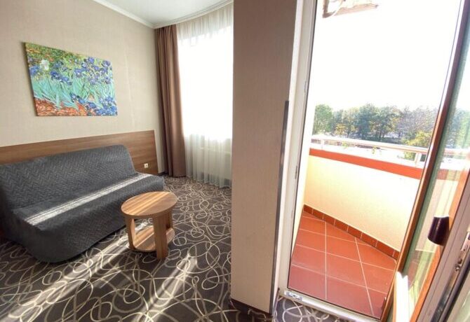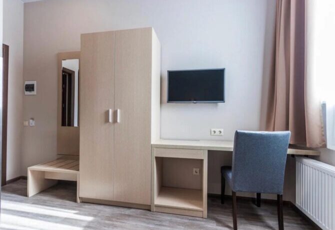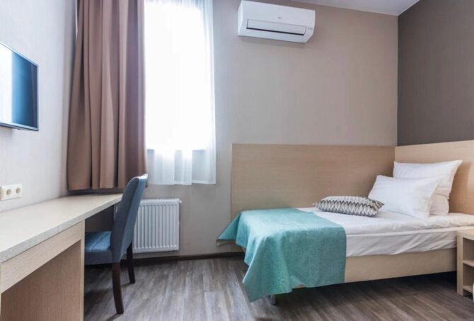- одноместный – его площадь всего 11,5 м2, но даже этого места предостаточно, чтобы постояльцы чувствовали себя комфортно. Номер оформлен в светлых пастельных тонах, что прекрасно гармонирует с классической современной мебелью. Спальные места обеспечиваются односпальной кроватью. Кроме этого в номере есть кресло-кровать;