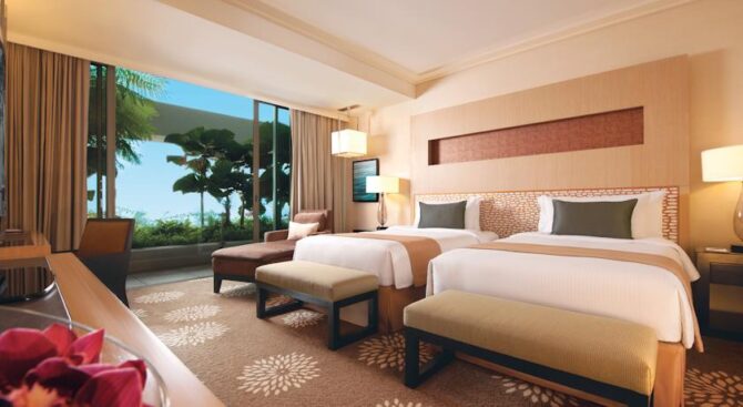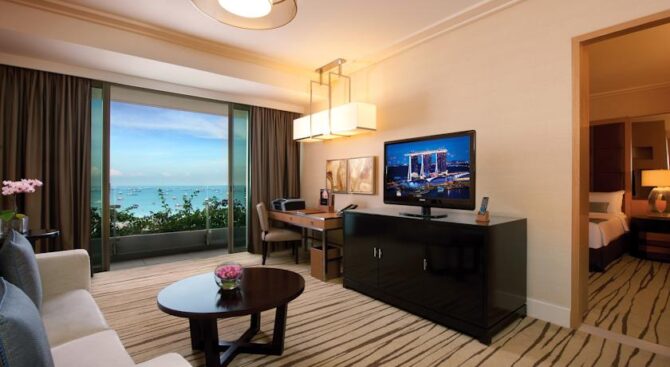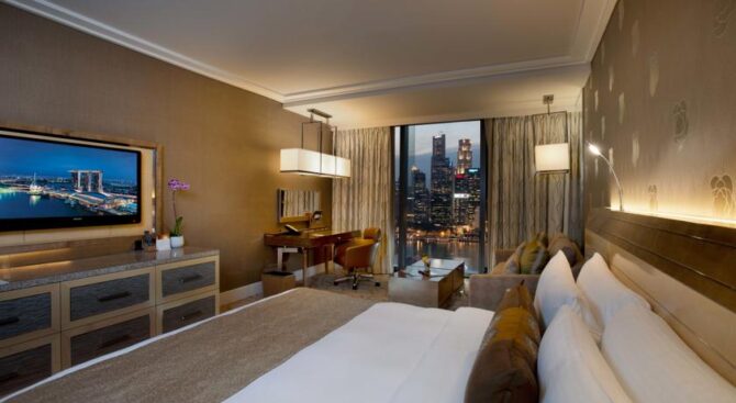 Помимо этого, номера оснащены элегантной деревянной мебелью темных оттенков, уютными ковровыми покрытиями на полах, и телевизором, на котором можно посмотреть любимые каналы. Все окна в этом отеле сделаны французскими мастерами. Из апартаментов открывается великолепный вид на Сингапур.