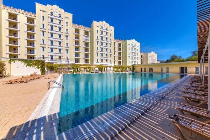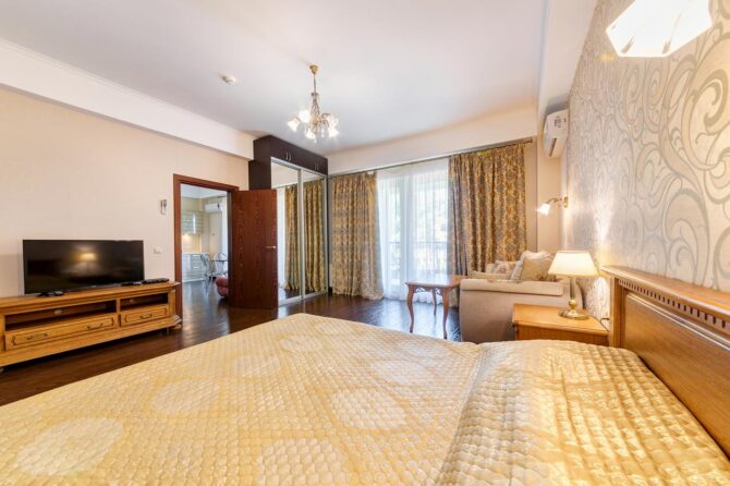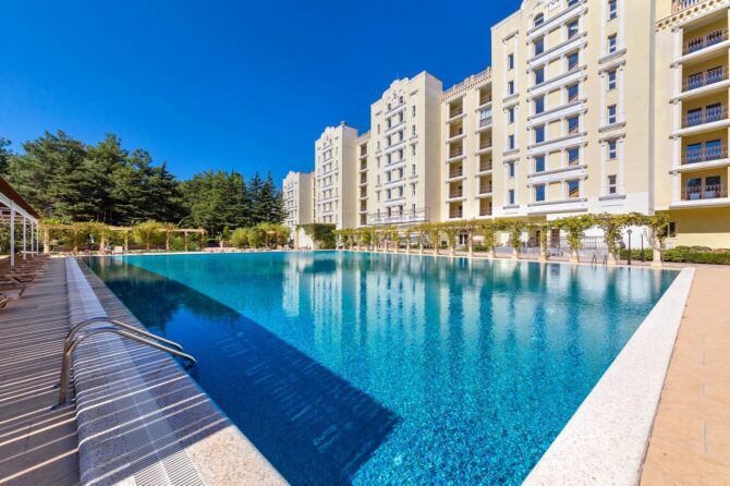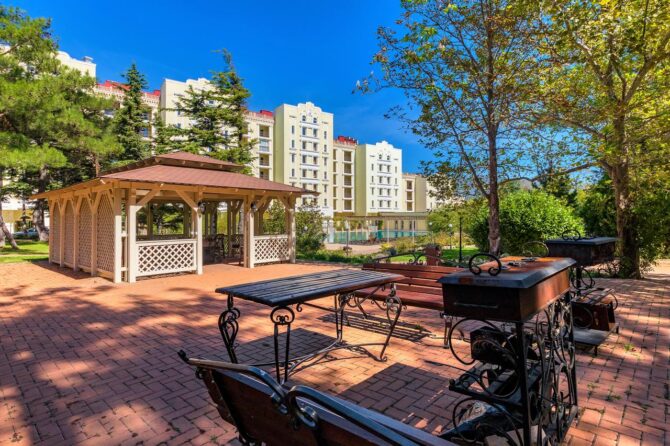 Роскошные номера отеля “Сады морей” выдержаны в неоклассическом стиле, и любители пышных интерьеров будут в восторге от разнообразия выбора размещения. На просторной территории комплекса построены 8 различных зданий, включая главное под названием “Клод Моне”. Именно в нем наибольшее количество апартаментов — 92. Абсолютно точно, что гости могут испытать затруднения при бронировании, настолько все типы номеров хороши. Это и стильные студии для пар, и просторные семейные апартаменты, многие двухуровневые, со свободной планировкой. Все номера имеют балкон или террасу, некоторые из них настолько просторные, что имеют обеденную зону и место для барбекю.