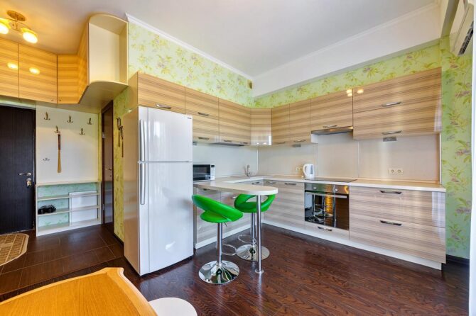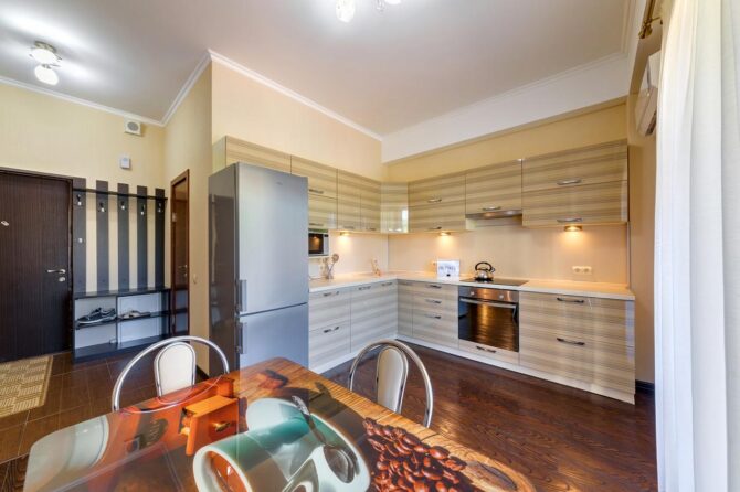Интерьеры выполнены только из натуральных материалов в спокойных тонах, гостиные, спальни и ванные комнаты укомплектованы дорогостоящей техникой. Прости во всех апартаментах есть кухня с большой обеденной зоной.