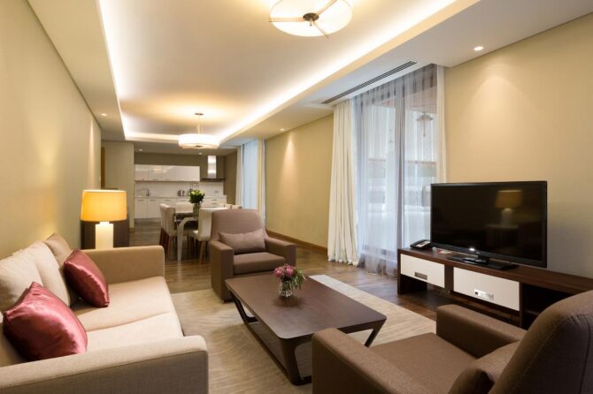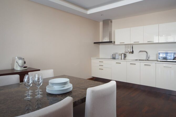- Пентхаус – 3. Каждый имеет площадь 228 кв.м, по 3 спальни, гостиную и обеденную зоны, оборудованную кухню.