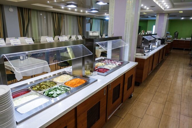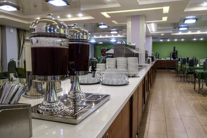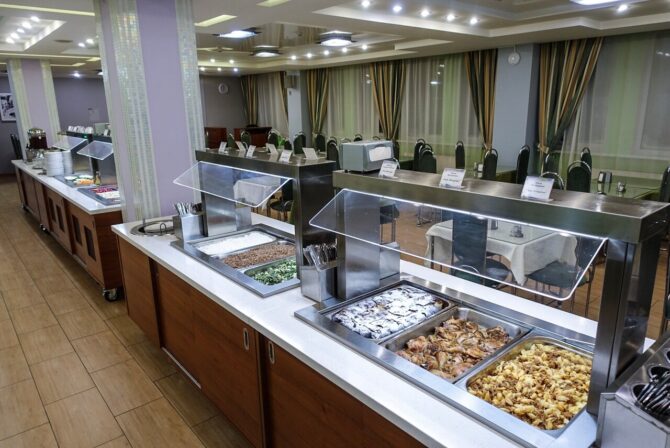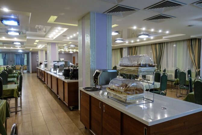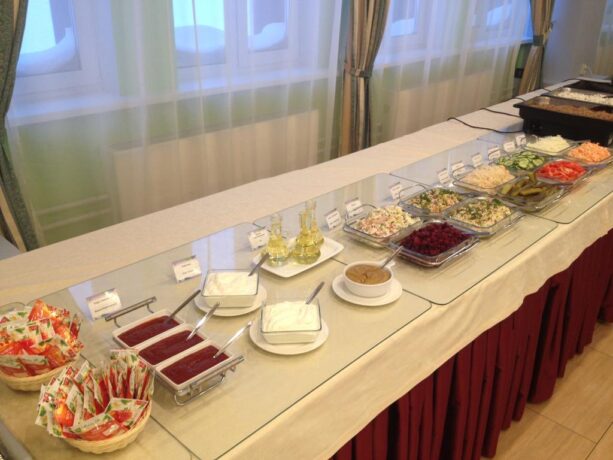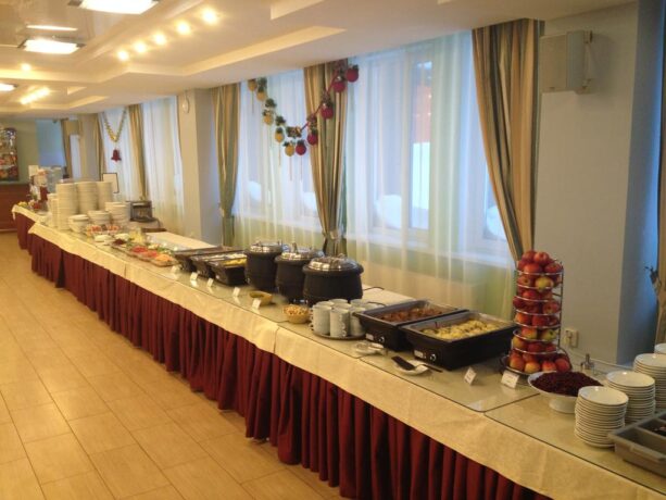 Для гостей отеля «Тирвас» организовано трехразовое питание по системе «шведский стол». Каждый день предлагается новое меню. При этом есть возможность выбрать диетическое меню в зависимости от того, какие у вас противопоказания. Кроме ресторана работает кафе, где тоже можно перекусить, освежиться прохладительным напитком, выпить чай или кофе, попробовать какое-нибудь лакомство.