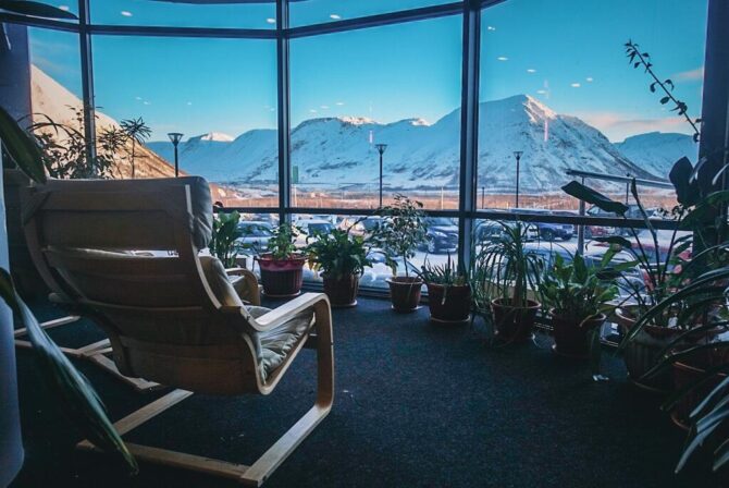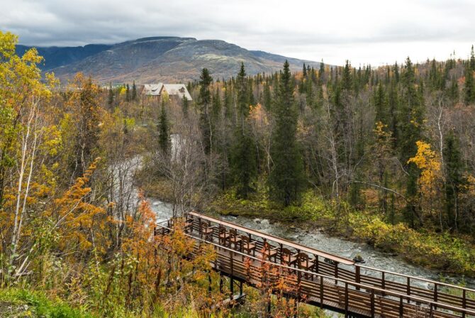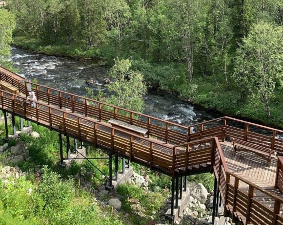Прогуляйтесь из отеля к смотровой площадке. По удобной деревянной лестнице можно спуститься вниз по крутому склону практически к самой воде бурной горной речки Вудъяврйок. Так вы попадете на небольшую набережную, где можно отдохнуть на скамейке в окружении умиротворяющей природы.