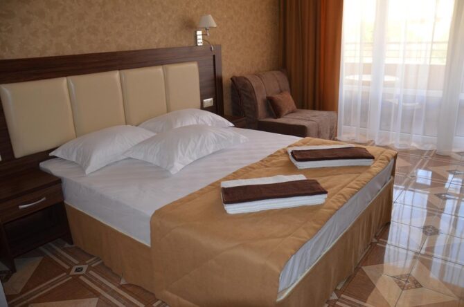 - Улучшенный двухместный Стандарт с балконом. Кроме двуспальной кровати есть удобное кресло, на балконе установлены садовые столик и стулья.