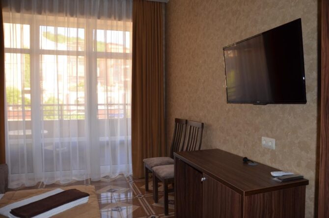 - Делюкс с кроватью размером «Куин-сайз». Имеется рабочая зона с письменным столом, два кресла с журнальным столиком для чаепития или вечерних бесед. Окна большие, практически до пола. На них установлены москитные сетки. В ванной комнате есть биде.