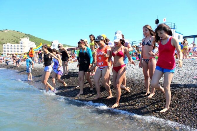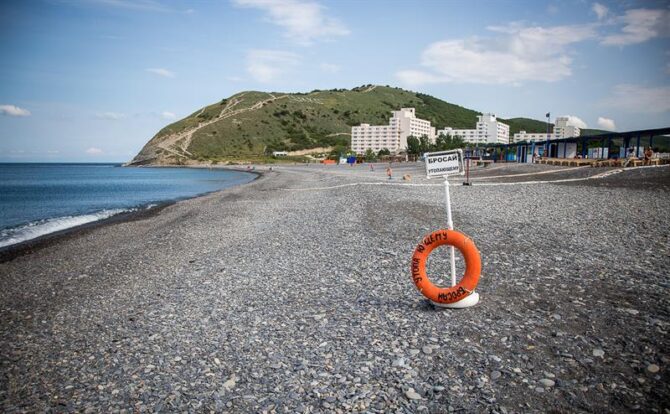 Слева находится пляж детского оздоровительного центра «Смена». Вход свободный. На территории работает служба спасателей, есть огороженная зона для детского купания с водными горками.