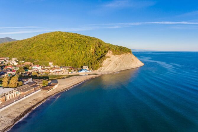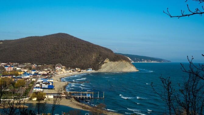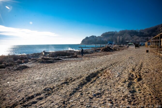 Растянулся на 800 м в центральной части посёлка. Его территория условно разделена между санаториями и домами отдыха. Западная часть, к примеру, находится во владении санатория «Архипо-Осиповка». Однако доступ сюда свободный. Упомянутая здравница лишь следит за чистотой и порядком. Галечный пляж оборудован раздевалками, фонтанчиками для питья, спортивными площадками. Вдоль него проходит Приморский бульвар ˗ главная развлекательная улица с большим количеством кафе и ресторанов. На самом пляже работают пункты проката пляжного оборудования, масок и ласт. Здесь можно заказать прогулку на лодке или покататься на банане.