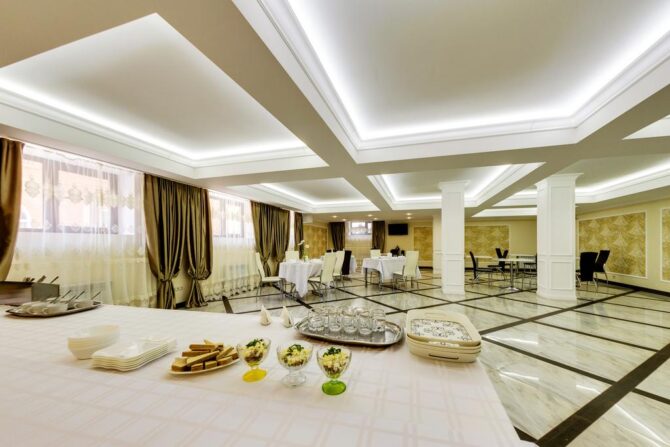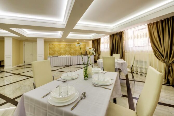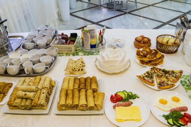 - Кафе «Шахерезада» специализируется на китайской, японской и узбекской кухне. В меню блюда из мяса и рыбы, большое количество свежих овощей и фруктов. Утром здесь подаются завтраки со свежей выпечкой. Еду можно взять навынос. Также доступна бесплатная доставка в отель.