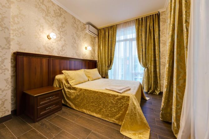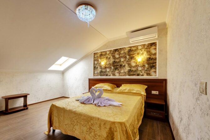 - Четырехместный двухкомнатный номер с балконом. К услугам гостей удобная сплит-система, двуспальная кровать, диван-кровать, платяной шкаф. В номере отдельный санузел.