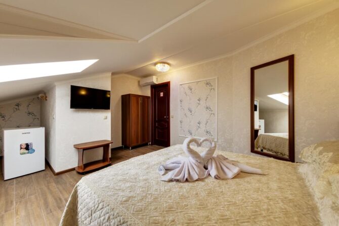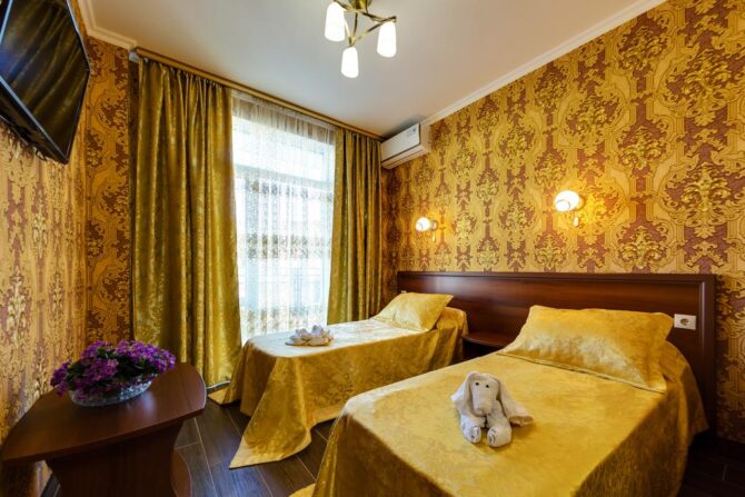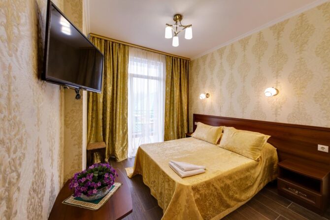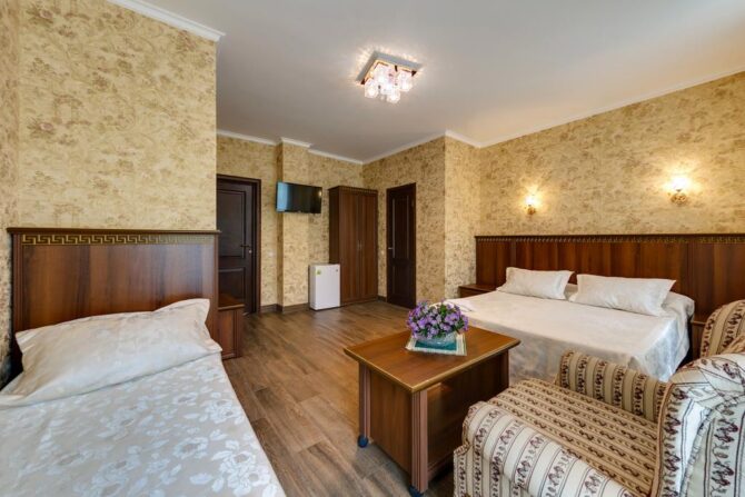 - Трёхместный номер с двумя кроватями: двуспальной и односпальной. При необходимости можно поставить детскую кроватку или манеж. Вид из окна зависит от расположения номера. Гости могут любоваться горами или панорамным видом на море и посёлок.