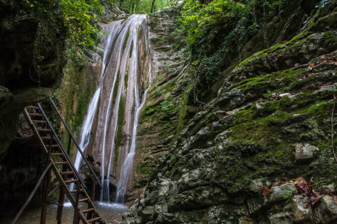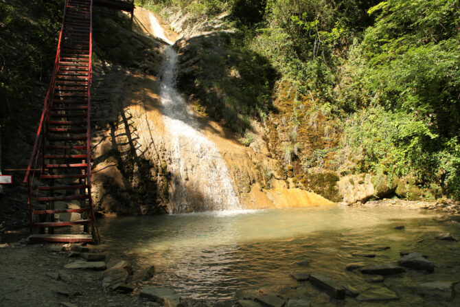 В окрестностях посёлка находятся Тешебские водопады, куда можно приехать самостоятельно или вместе с гидом. Маршрут экскурсии проходит по экологической тропе через водопады Грот, Шнурок, Пасть дьявола и составляет около 5 км. Весь путь промаркирован. Даже если вы решили отправиться на прогулку самостоятельно, указатели помогут вам не сбиться с дороги. Через ручьи построены небольшие мостики, на скалах оборудованы железные лестницы с поручнями. Экскурсия предполагает несколько остановок. Вдоль маршрута оборудовано несколько площадок для пикников.