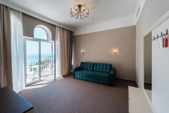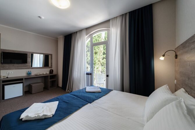 - Комфорт с двумя спальными местами. Эта категория считается самой гостеприимной и комфортной в отеле «Усадьба Голубой Залив». Здесь также есть балкон с видом на море или деревья. Можно наслаждаться сочетанием горного и морского воздуха, не выходя из номера. Завтрак включен в стоимость.