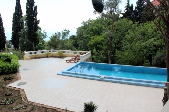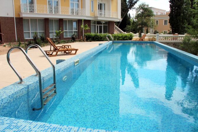 Летом в отеле «Вилла Голубой Залив» можно покупаться и в 10-метровом открытом бассейне. Предлагаются услуги официантов ресторана у бассейна. Можно заказать прохладительные напитки, коктейли, закуски и мороженое и удобно расположиться на шезлонге, позагорать, полюбоваться красивым парком и видом на Черное море. Зона отдыха вокруг бассейна оборудована затененными зонтиками, душем, туалетом, шезлонгами и фоновой музыкой. Бассейн украшен голубой мозаикой и имеет декоративное освещение, которое включается в вечернее время.
