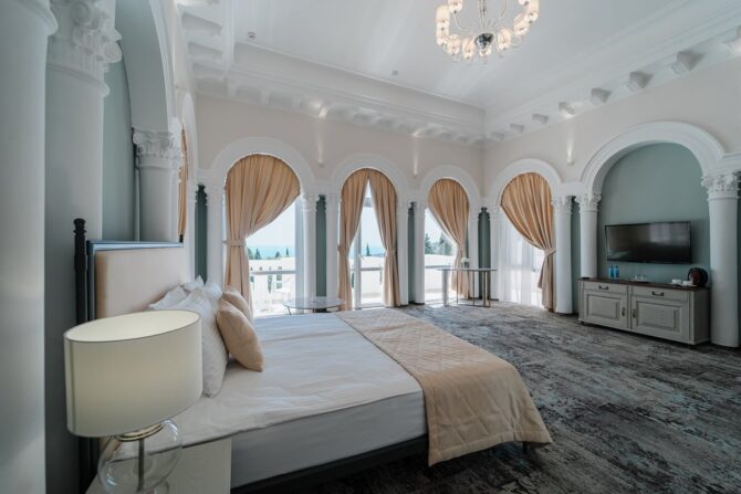 - Трехкомнатный люкс с тремя спальными местами. Большой номер с балконом расположен в вилле XIX века «Лимен». Площадь номера — 50 квадратных метров. Здесь с комфортом могут разместиться до 4 человек. Две спальни. В первой — большая ортопедическая кровать king-size и туалетный столик с табуретками, во второй — две односпальные кровати. Гостиная с удобным диваном, зоной отдыха, шкафом для одежды. Есть лежачая ванна. Эти номера расположены на 3 этаже здания, выходящего на южную сторону. Окна и балконы выходят на парк отеля и бассейн.