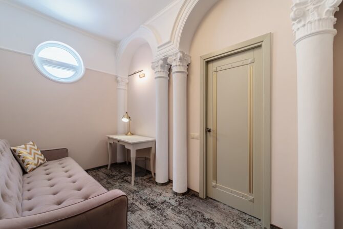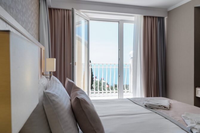 - Премиум бизнес-люкс. Эти номера расположены на верхних этажах исторической виллы Limen и Panea. К достоинствам номеров можно отнести: огромную панорамную террасу с видом на море. В комнатах есть двуспальные кровати и большие диваны. Ванные комнаты оборудованы душем, ванной и биде.