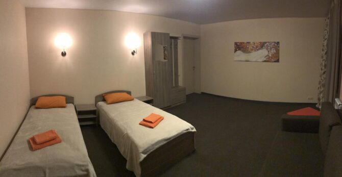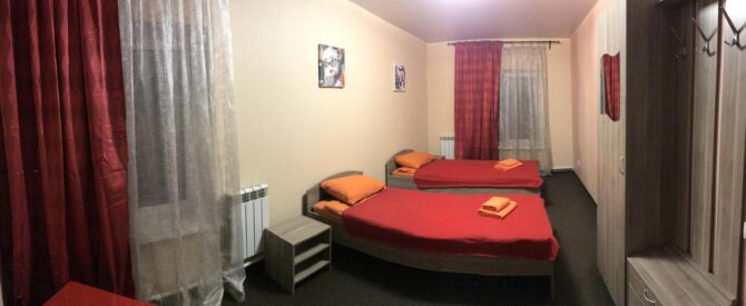 5. Четырёхместный эконом. В родной комнате расположены две односпальные или одна двухспальная кровать и раскладной диван. Также в номере есть телевизор и чайник. Душ и туалет на этаже.