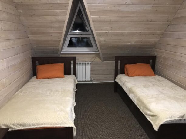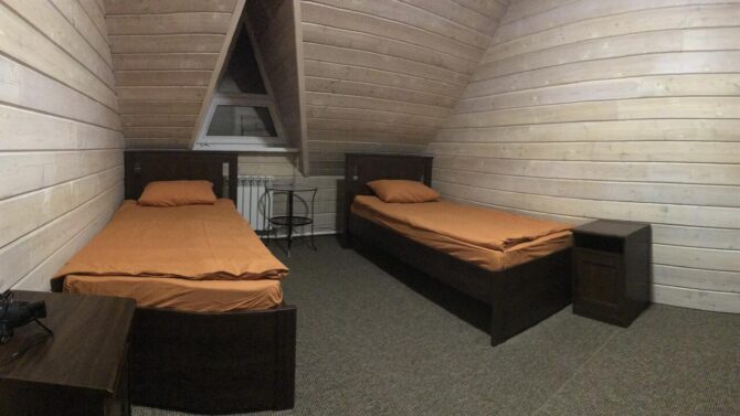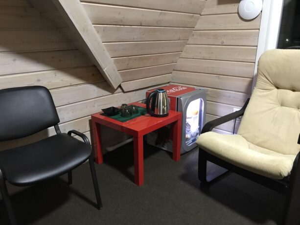 4. Туркласс +. Особенность этого номера в том, что он расположен под крышей, поэтому потолок и стены нестандартные. Здесь есть все, что может понадобиться двум туристам: кровати, мини-холодильник, столовая техника, посуда и фен. Душевая находится не в самой комнате и рассчитана на 2 номера.