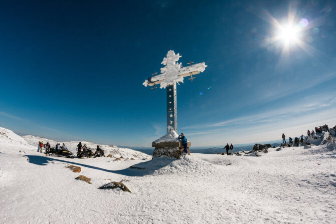 5. Гора Курган. Вторая по высоте вершина на территории курорта — 1,555 километров. Она привлекает туристов невозможностью прокатиться на ней, а огромным поклонным крестом расположенным на вершине горы.