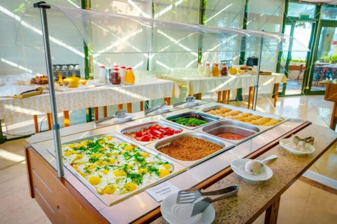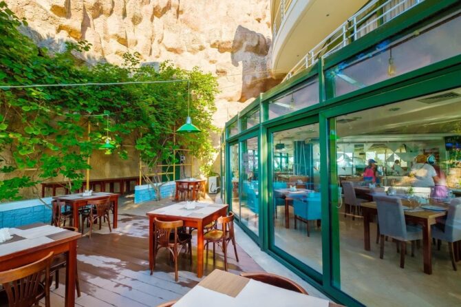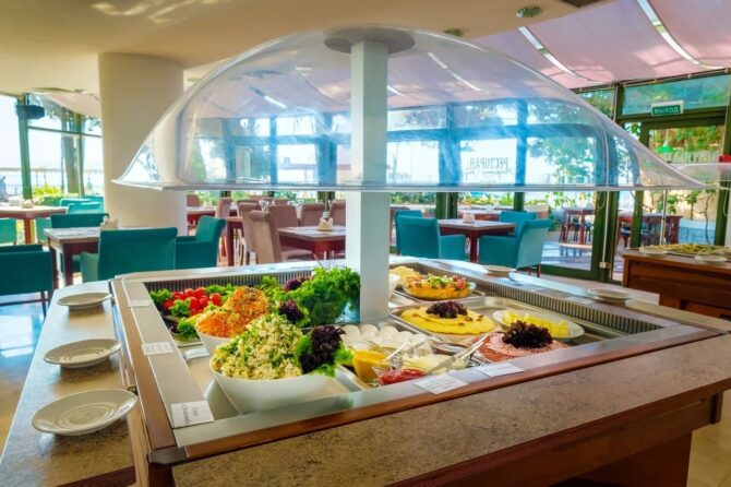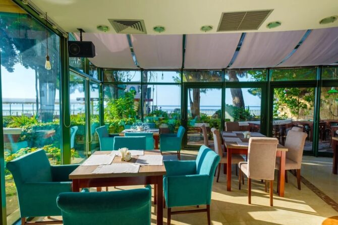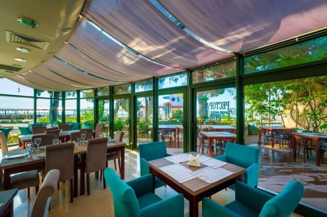 Еще один ресторан комплекса носит название «Морской». Работает по системе «Все включено». Кроме стандартных блюд здесь можно отведать вкуснейшие десерты, мороженое, выпечку или насладиться бокалом ароматного вина. На территории отельного комплекса открыто несколько баров с прохладительными напитками. А в аквапарке функционирует линия фаст-фуд для быстрого перекуса.