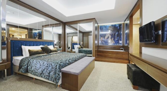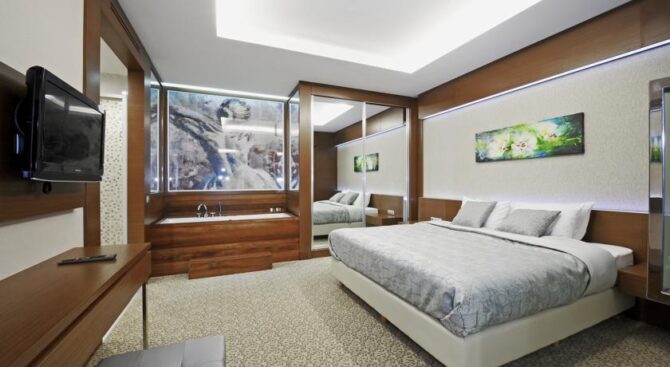 Для размещения отдыхающих предоставляются просторные номера с ярким, необычным дизайном. Особенное настроение в апартаментах создают цветовые пятна – покрывала, шторы и обивка мебели неожиданно сочных оттенков. В стоимость номера входит посещение: